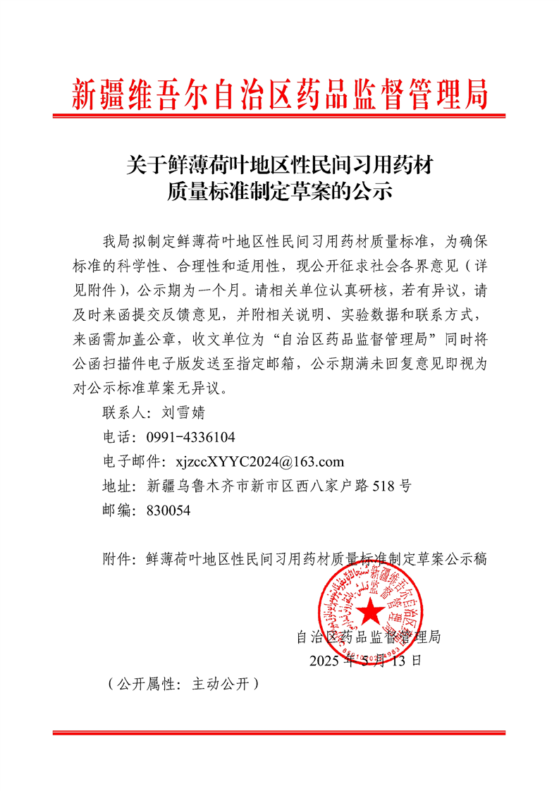 关于鲜薄荷叶地区性民间习用药材质量标准制定草案的公示